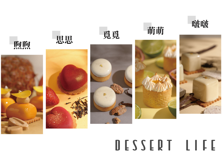 以爱情五階段為發想主軸,運用疊字代表成雙成對,將愛情中的酸甜苦辣藏進甜點裡,